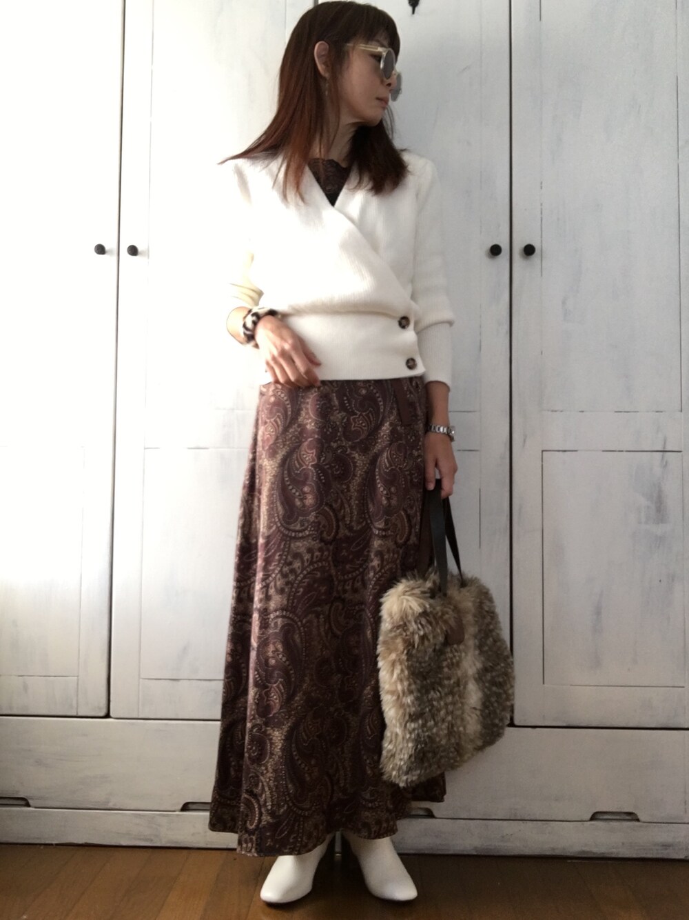 CORNERSのカシュクールニットは、程よい厚みでもちもち感があります。カシュクールのかたちだと、生地によぅてはだらしなくなる事も多いですが、この生地感なら大丈夫🙆♀️ ほぼ毎日同じ形を色違いで着ているインナーのレースが首元から見えてええ感じ。 ページボーイのスカートはペイズリー柄にフォーリンラブして購入した次第。 よい一日を!