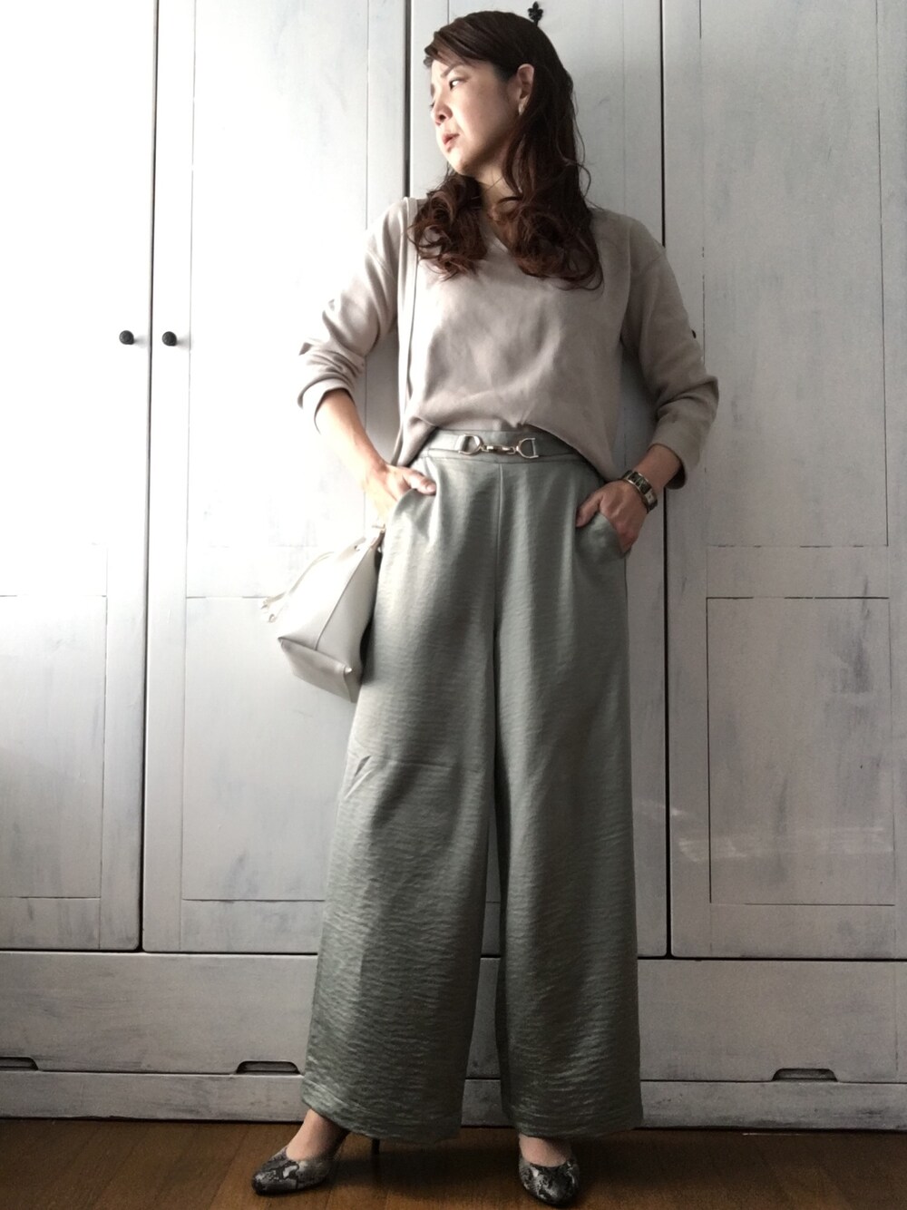 くすんだグリーンのパンツは控えめな光沢がかわいいです(о´∀`о) 今日はワイドパンツとピンヒールの組み合わせの気分でした。 よい一日を!