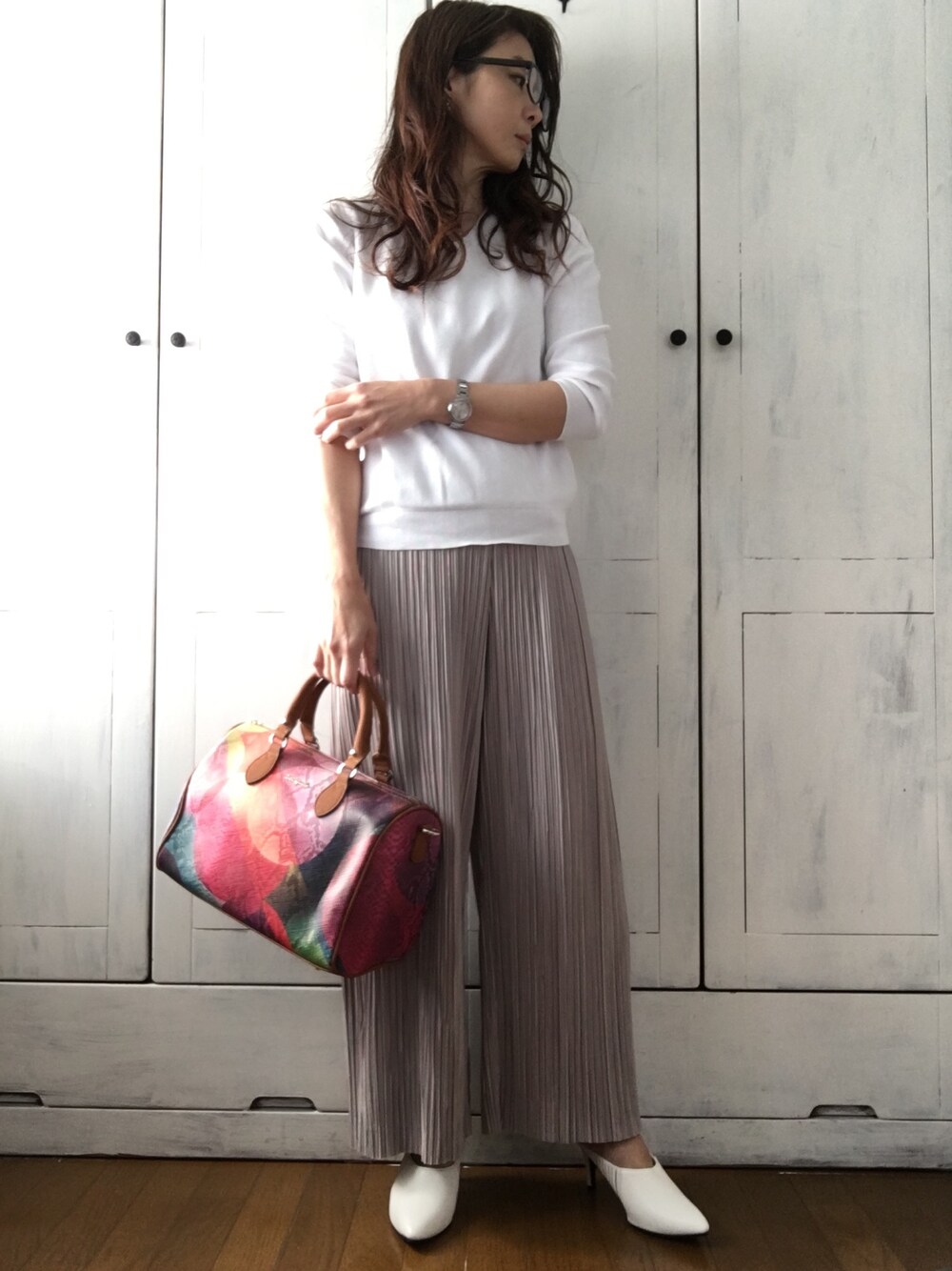 履き心地のよいプリーツパンツで通勤コーデ。 くすみベージュのパンツに白ニットで落ち着いた感じにしました。 バッグが差し色(о´∀`о) よい一日を!