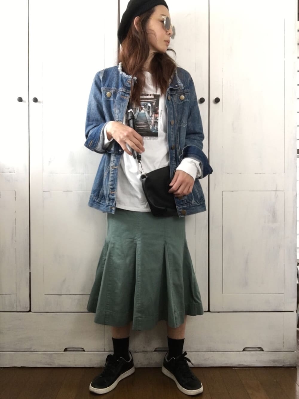 #グリーン ビスチェとセットアップで販売されていたスカートだけ着回し。コットン素材の優しいグリーンです☘ Tシャツはページボーイ。結構前に購入した物ですが、ちょうどよい肉厚感とゆったり感が気に入っていて、ロンT着ようと思ったらこればっかり着ています。 お気に入りの服があるっていい。 心強い(о´∀`о) ソマリのデニムジャケットは寸胴シルエットがめちゃかわいい💕と言う事でこれもすごくお気に入りです。 ちょっと前に知り合えたtuetanさんも入手されたそうでなんか嬉しい✨勝手にわくわくしております❤️ よい一日を!