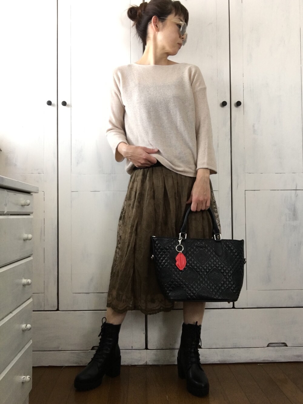 しぶいカーキのレースのスカート。 ごつめブーツを合わせました。 スカートにうじゃうじゃとリトルミィやらムーミンやら散らかっている事は誰も知るまい(о´∀`о) よい一日を!
