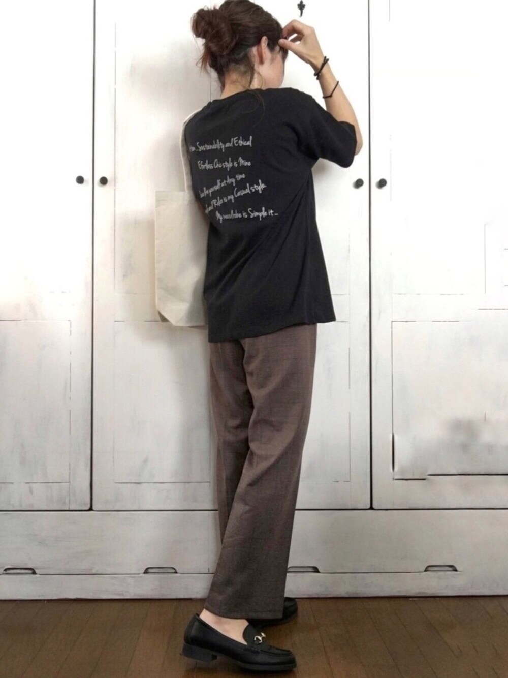 まゆみんのTシャツ/カットソー「WEARISTA maiko - オーバーサイズバッグメッセージプリントTee made in INTER FACTORY」を使ったコーディネート