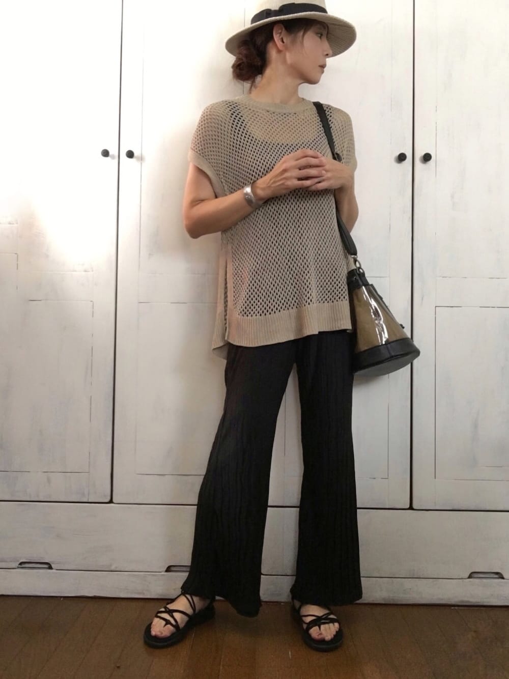 まゆみんのベスト「シアーシースルーフィッシュネットビッグベスト/ニットベスト」を使ったコーディネート