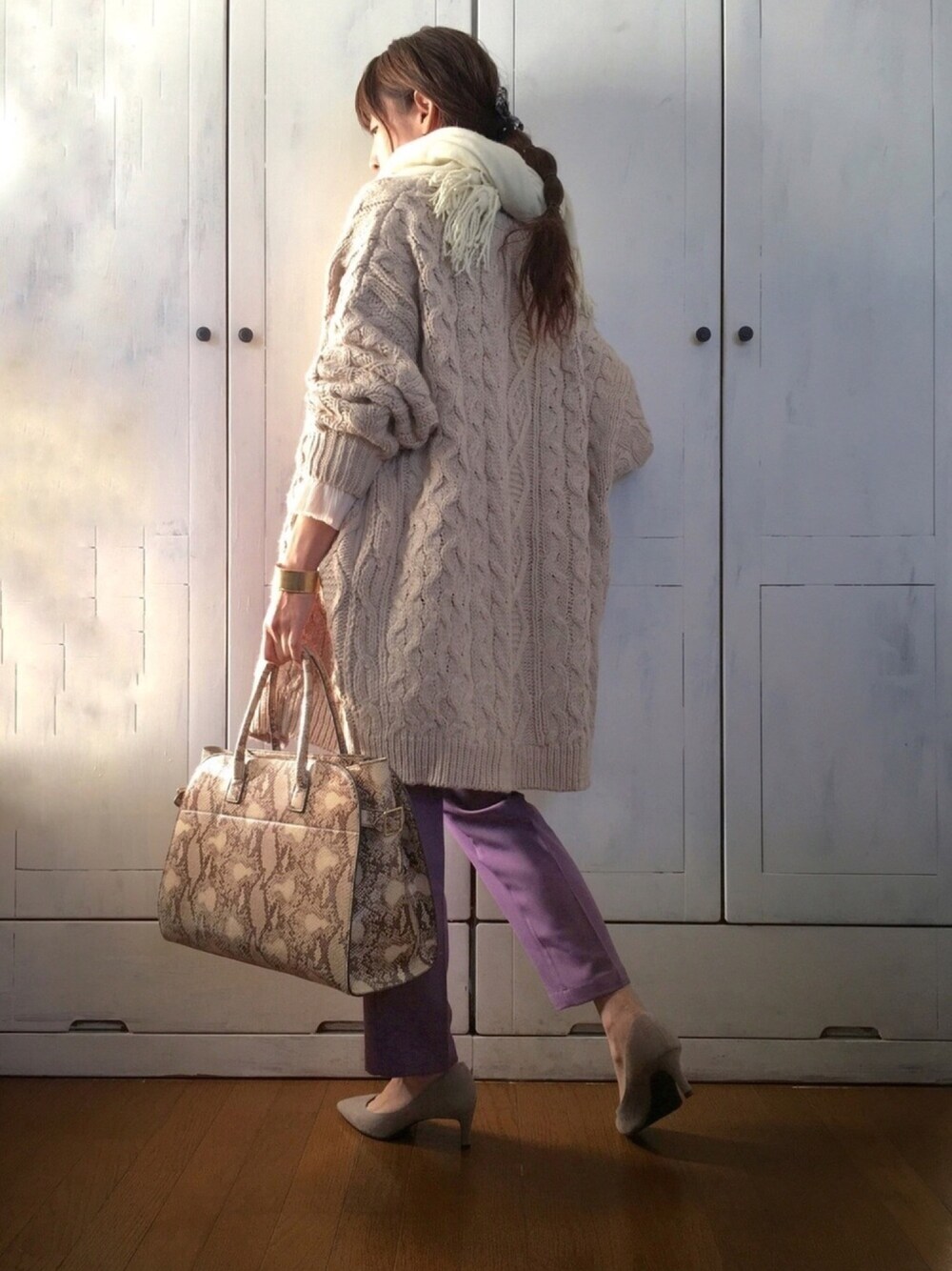 紫色のおパンツがいい感じです。センタープレスできれい目でテーパードで、そして少し濃い目のパーポーのものが欲しかったので、ちょうどよい巡り合わせでした(о´∀`о)プチプラですし✨ アンティカのざっくりカーデにあわせました。袖口からGUのトップスのぴろぴろを出しております。 みなさまいつもありがとうございます😊