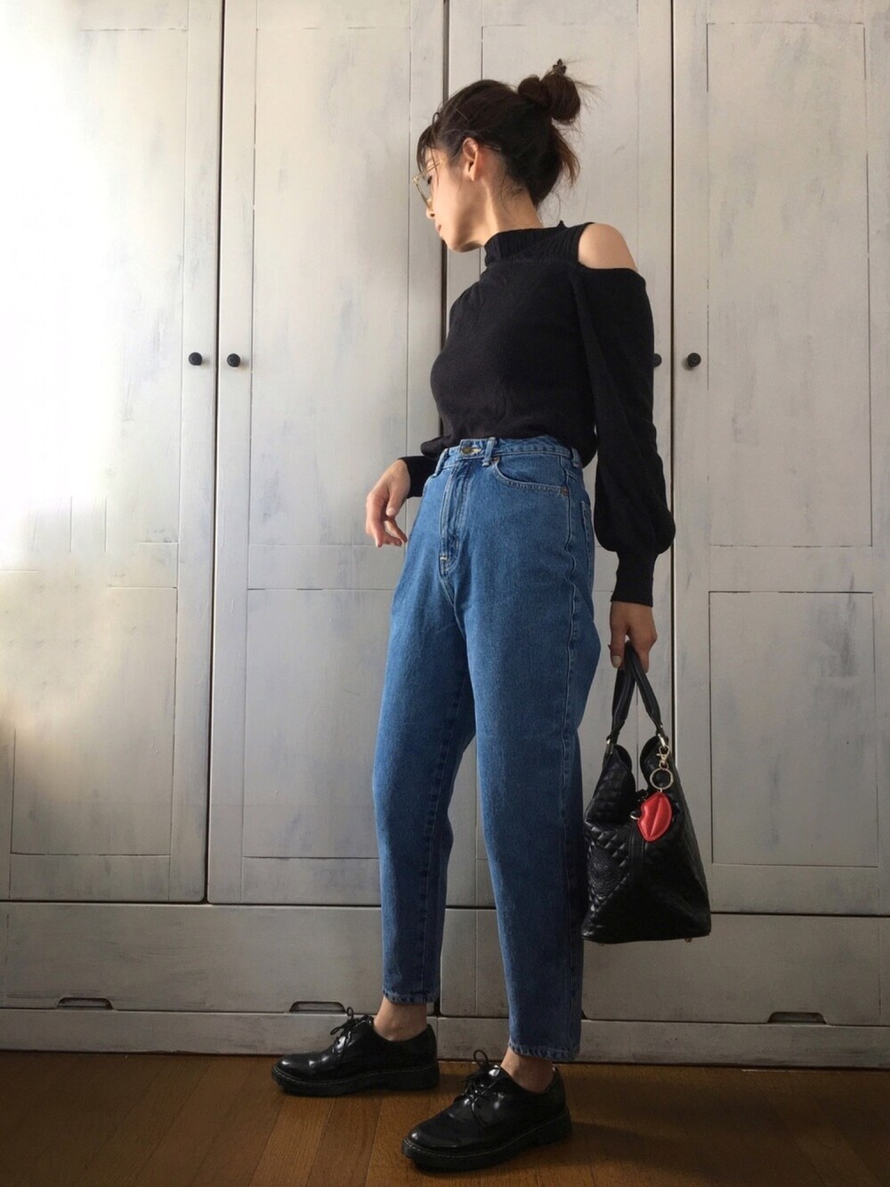 形の良さがすっかり気に入ったデニム、着回し。腰から太ももにかけてゆとりがあるので、トップスインしても心細さ😂がなくとてもいいです。 おっちゃん靴を合わせたかったので上半身は少し女性っぽい肩あきのニットにしました。 デシグアルのバッグは付属のくちびるチャームがとんでもなくかわいいです😍 みなさまいつもありがとうございます😊