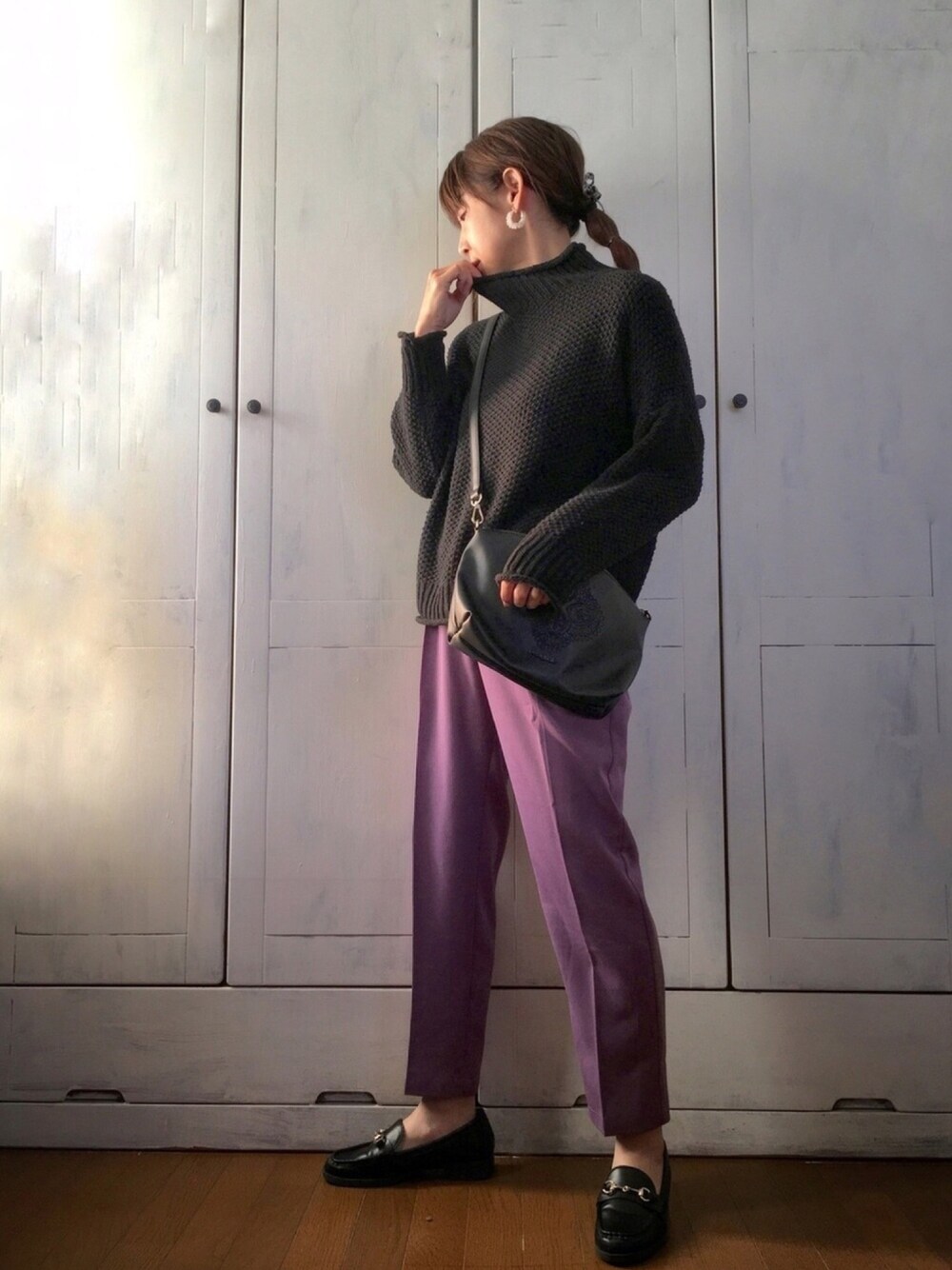 リブラのルーズフィットニット。先に持っていたベージュがすごく良かったので 色違いでゲットしたものです(о´∀`о) ムラサキおパンツとしっとり大人コーデ。 きらきらビジューのループピアスが小さいながら存在感あり、着けてるのと着けてないのとでは大違い👀✨ みなさまいつもありがとうございます😊