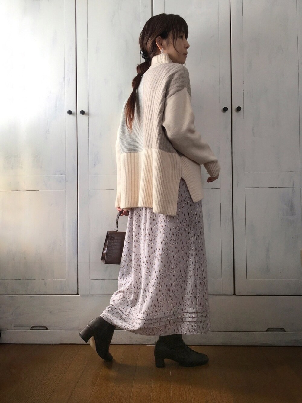 配色がかわいいニットを着回し。 小花柄(私にはレオパ柄に見える)で裾のタックが甘いワンピをスカート見えにして合わせました。 ブーツはスクエアトゥ。甘めにもクールめにも合うので重宝します(о´∀`о) みなさまいつもありがとうございます😊