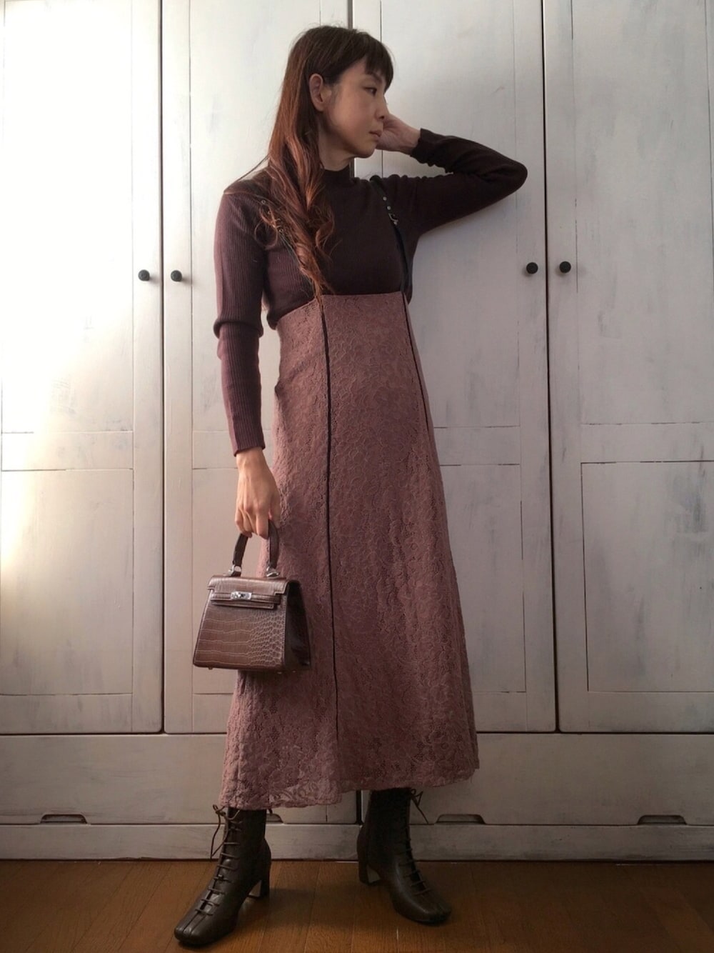 レースに合皮のサスペンダーがたまらぬワンピ。これまたアイロン不要(洗濯後すぐ干す!)な我々の味方アイテム。思ったよりからだのライン出にくくて重宝しています。 背中だけにゴムか入っているウエストも、シャーリングになっていて後ろ姿の雰囲気を可愛めにしてくれています。 ワンピ以外をブラウンでまとめました。 みなさまいつも有り難うございます。