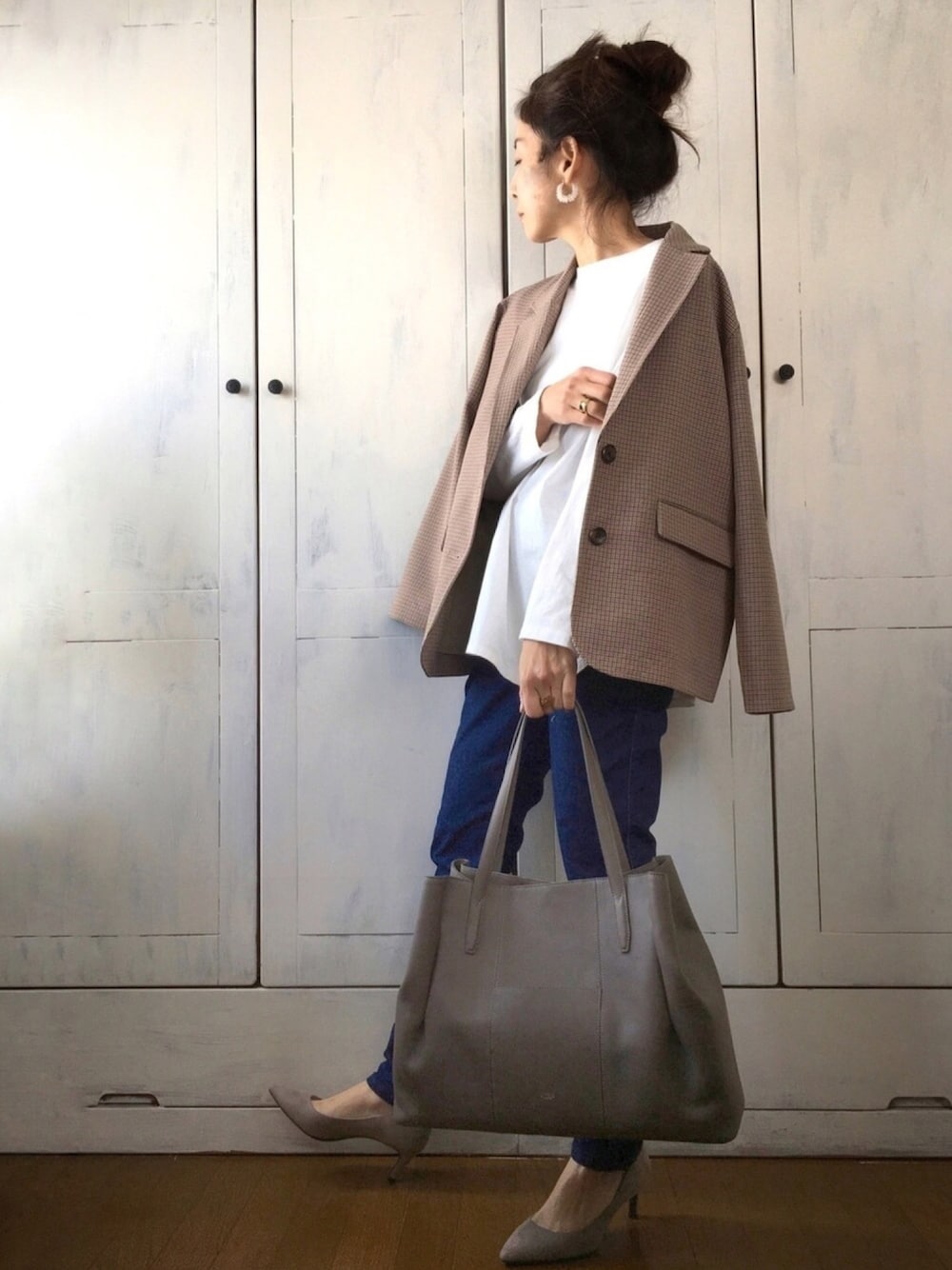 滑らかできちんとした生地のジャケット。ガンクラブチェックの柄がちょこっとだけおじさん感があり、カジュアルなアイテムと合わせるとこの上なく可愛くなります。 穿きやす過ぎてここのところずっと愛用しているLeeのジェギンスと。ジャケットにも合う、程よいきれいめデニムです。 CYPRISのバッグは、荷物少なめな時は中に付いているボタンで小ぶりモードに調整できます。だから形がばしっと決まっていつもキレイ✨ みなさまいつもありがとうございます😊