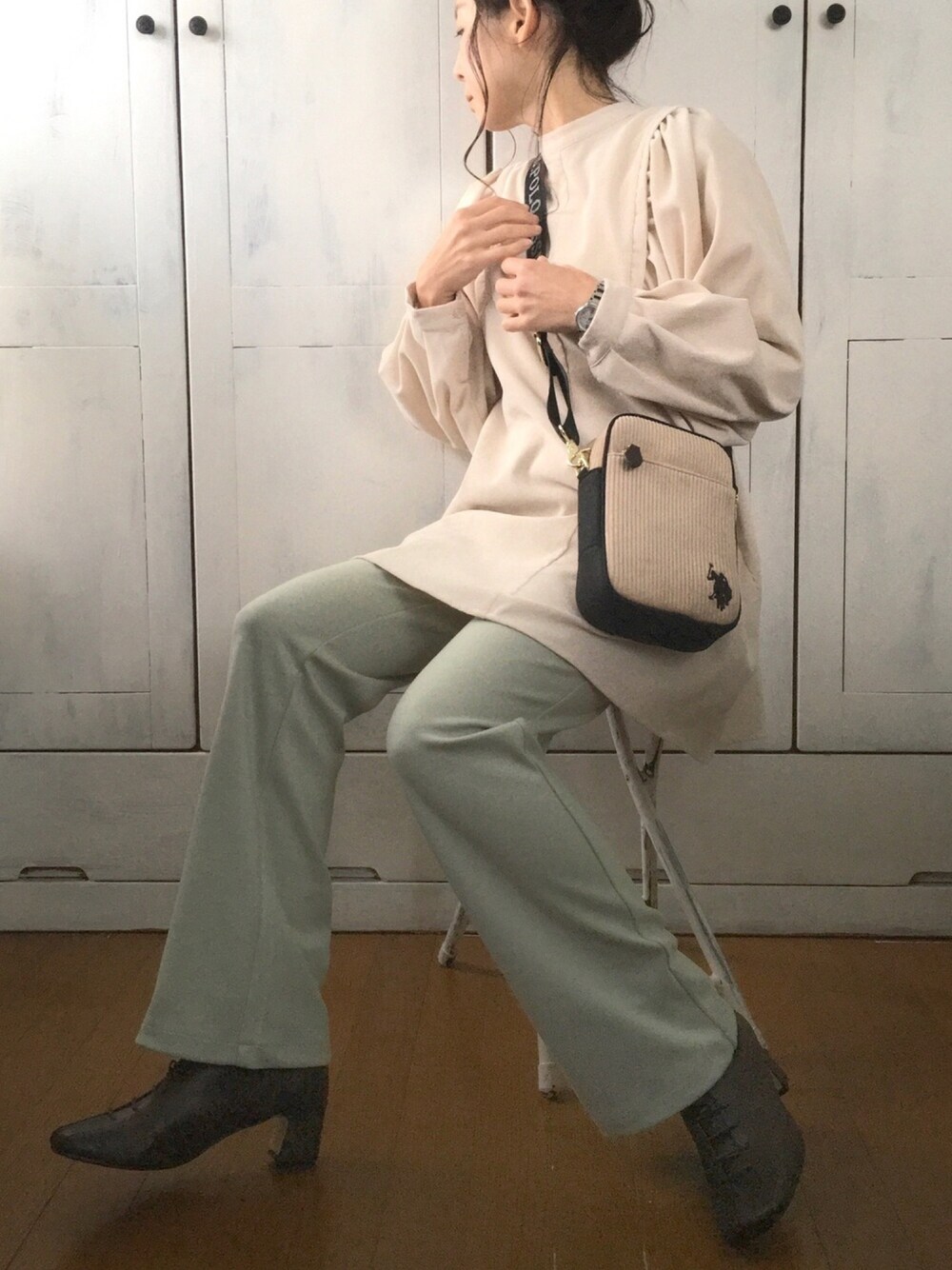 ミサリナさんの短丈ワンピに爽やかカラーのフレアパンツを合わせました。 ワンピ一枚で可愛く着たいのはやまやまですが、色々考えてやめときます😂 程よいフレア加減のパンツは春カラーですが暖か素材✨ワンピと合わせると少しレトロな雰囲気か出てかわいいー💕 ショルダーバッグは実は肩紐2つ付いてます。一方はシンプルな無地なもので、今回使用しているのは太字のロゴがどやさ!と並んでいるほう。ほっこりコーデにちらっとアクセント添えてくれるので私はこっちの紐が好き! みなさまいつもありがとうございます😊