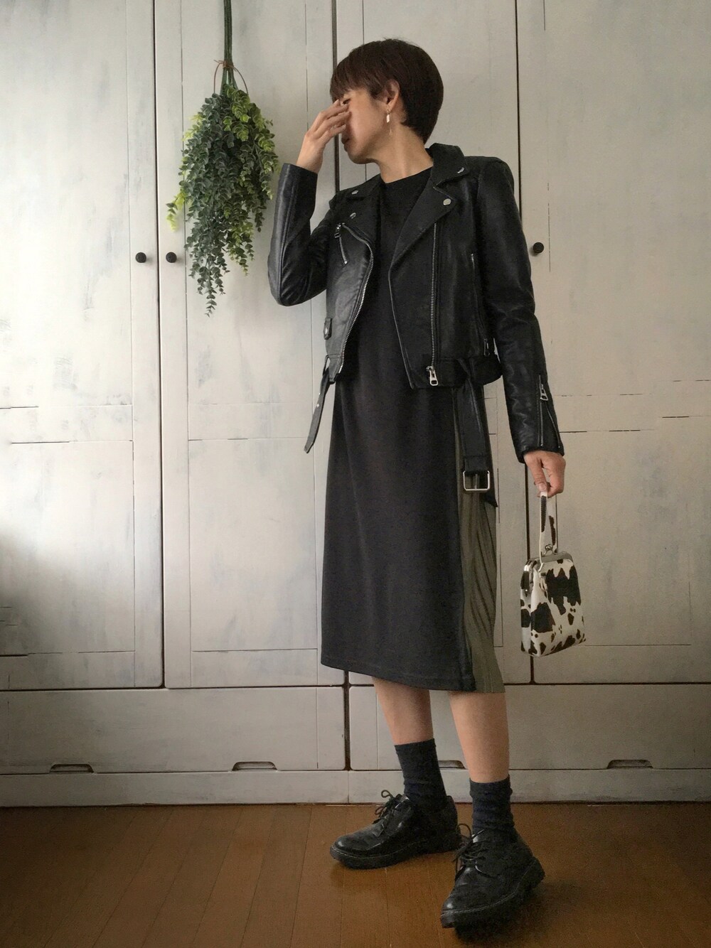 コトリカさんの #サイドレイヤードプリーツカットワンピース 今回はZARAのライダースに合わせました。 サイドのプリーツがチラ見えする感じがかわいいー♡ ワンピの生地が程よく軽めなので、ライダースの下に着ても嵩張りません♪ ショップにこにこさん←店名かわゆし の #アニマル柄がま口バッグ なかなかタイミング合わず入荷を待っていたもの。会いたかったよ牛ちゃん🐄❤️ ご覧いただきありがとうございました😊