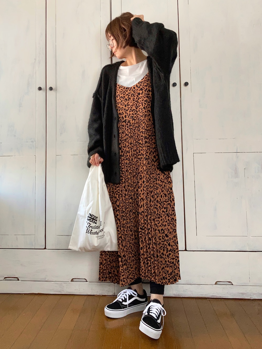 キャミワンピもカーディガンも、ゆるっとした着心地でリラックスできます。 要所に黒が入ると、全体が引きしまって、ゆるコーデにメリハリが生まれますね。 キャミワンピ ap retoro 落ち着いたレオパード柄。 スカート部分がプリーツ仕立てなので、歩く度軽やかに揺れる感じが女子力あり可愛いです。 カーディガン Freak’s store 起毛系のカーディガンで、柔らかく暖かいです。 袖口のゆるっと長めな感じが冬らしくて好きです。 今日のバッグは Traditional Weatherwearの今年の丸いロゴのトートバッグ使おう思うたのに、 今見たら去年のやつ持っている! いや去年のやつ、デザイン好きだけれども! 写真見るまで気がつかんかったことにびっくりした月曜日です。 皆さま今週もよい一週間をお過ごしくださいね。
