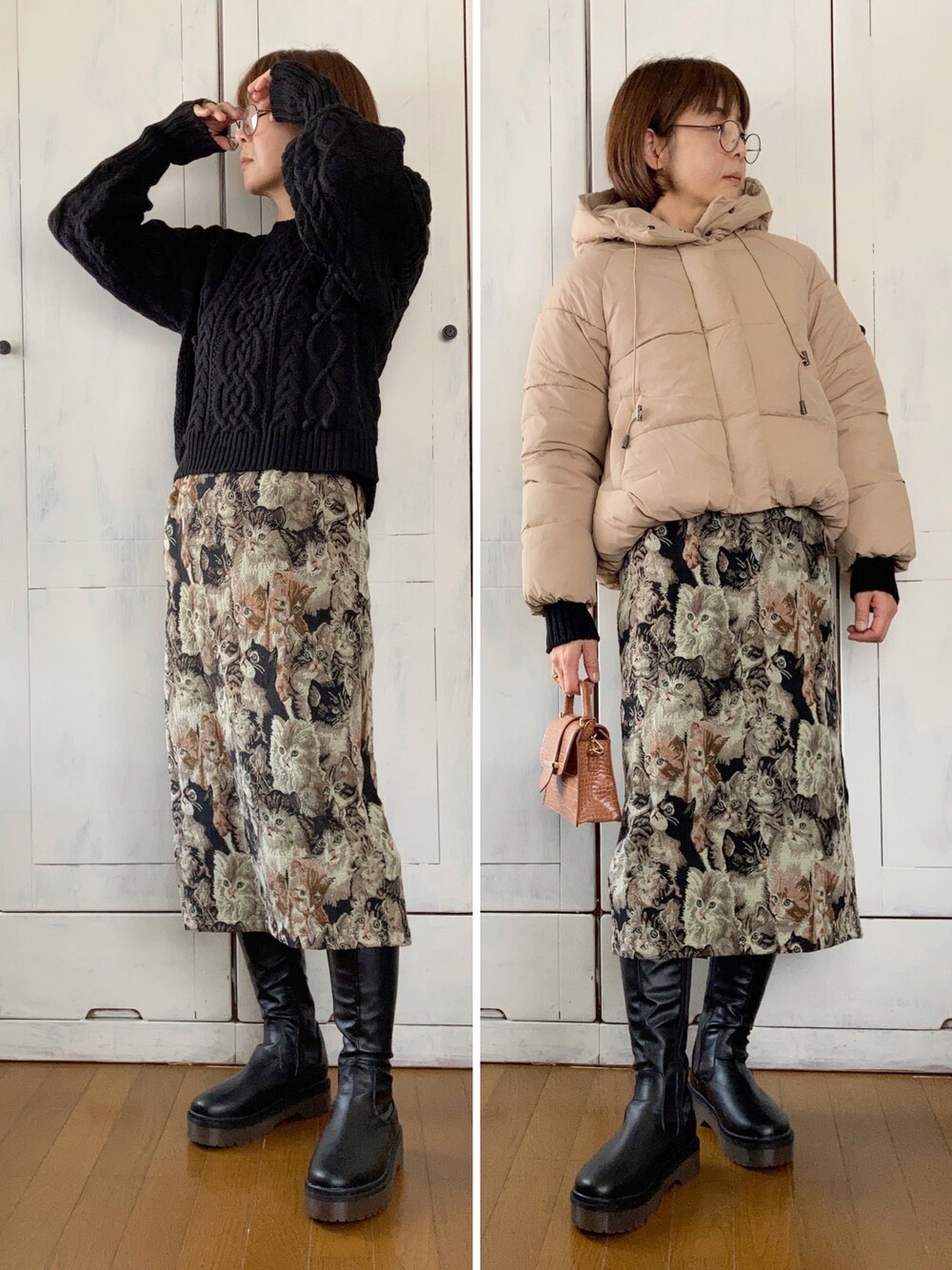 ゴブラン織の猫たっぷりスカート。 今年も活躍してくれます🐈 上半身はap retroさんたっぷり。 本日ZOZOTOWNクーポン有りの日です。 🌹エコダウンショートブルゾン スカートとも相性が良いのはこのショート丈のおかげかと。 ショート丈と言っても、お腹すっぽりカバーしてくれて暖かいです。 スカート、ワンピ良く着る方はひとつあると便利アイテム。 🌹ケーブル編みパフスリーブニット 一番好きなポイントは袖。 パフスリーブから、手首付近が長めにしゅっと絞ってあるのが何ともかわいい。 ご覧いただきありがとうございました。 どなたさまも、よい日曜日を。