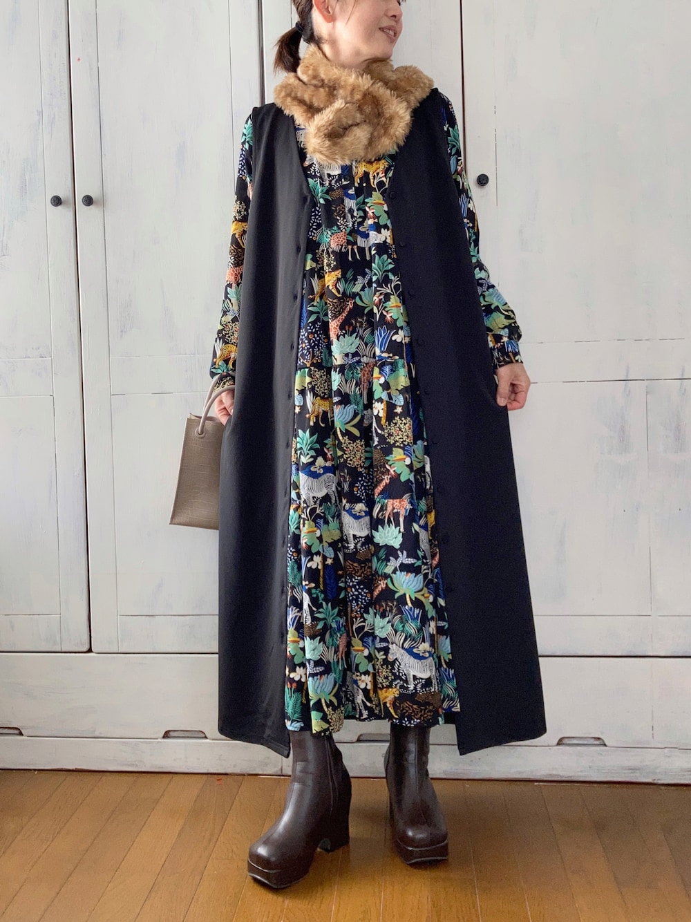 🌹 Vネックロングジャンスカ ap retro ボタンを開けて、ロングジレとして着回し。 ボタン閉じて前後2wayのワンピとしても着られて、多様に楽しめるワンピ✨ 大好きなマニャーナスエルテさんの新作サファリプリントワンピースに合わせました。 首元には鹿さん🦌柄のエコファーティペット。 動物モチーフ大好き露呈コーデ(о´∀`о) ご覧いただきありがとうございました😊 PR