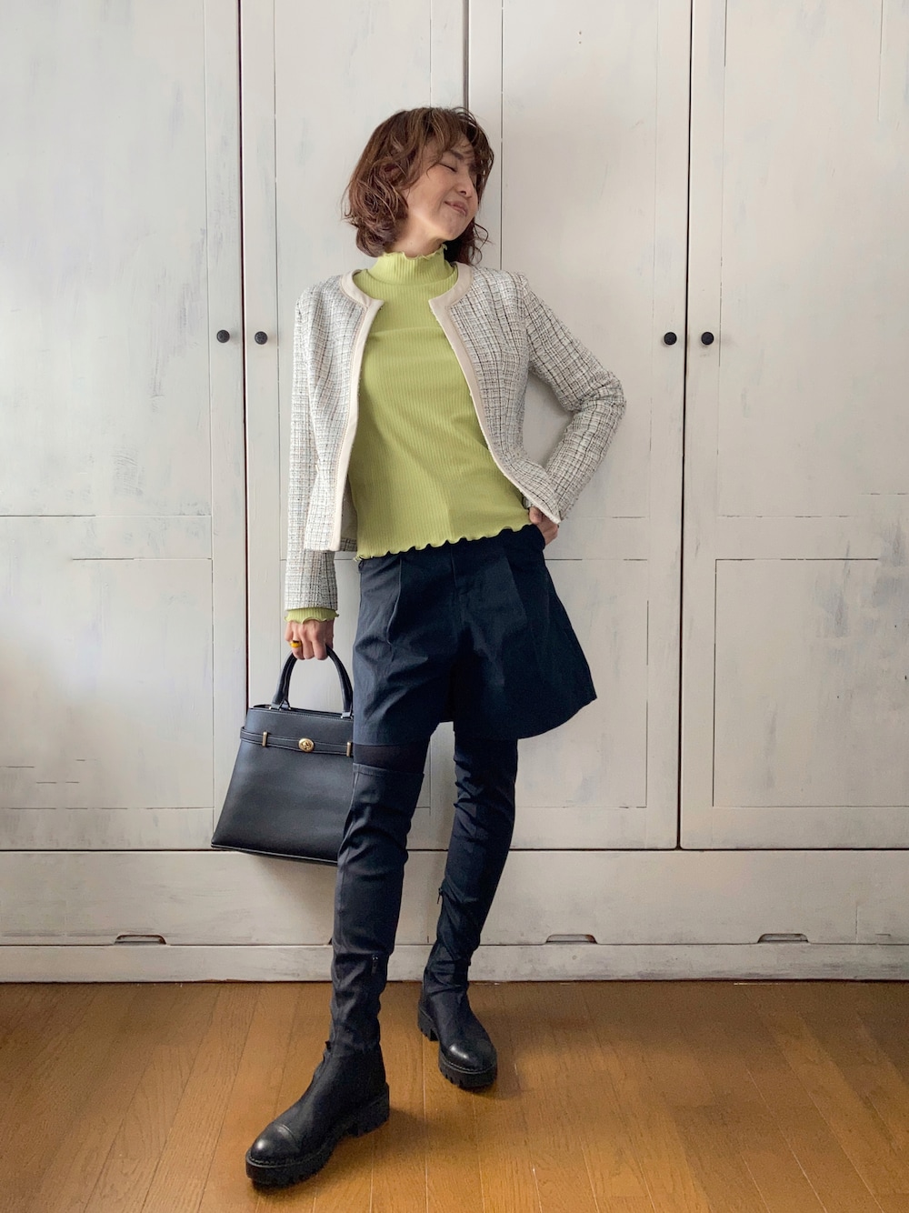 ツイードのお洋服着ていると、仕事でお世話になっている紳士(優しいおじいちゃん)たちにとても褒められます。 また、髪の毛くるくるに巻いているときも同様に褒められます。 共通のお好みが見えた気がします。 さて、上記反映したかのような、着回しコーデです。 ●3点セットスーツ White Joola セットのうち、ジャケットをデイリーコーデに活用。 前回投稿したリールに出ているコーデです。 ホワイトジョーラさんの公式ストアでは、セレモニー対象品30%オフの施策中。 この3点セットも対象ですよ。 1,000円クーポン併用可能です。コード: ●ショートパンツ Edit Sheen シンプルな作りですが、前にタックが入っていることで自然な広がりができ、きれいなシルエットを作ってくれます。 ウエストはゴム無しですが程よいゆとりがあって快適です。 ● ランダムリブアウトメローハイネックプルオーバー w closet 春っぽい色味と透け過ぎない生地感がお気に入り。 ニーハイブーツはZARAです。 細身シルエットで厚底のこのバランスがとても好きな、長年の愛用品。