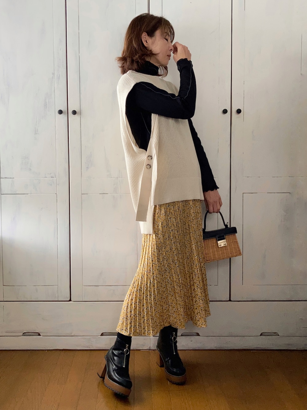 まゆみんのベスト「サイドベルトニットベスト」を使ったコーディネート
