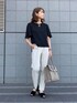 祝日もひっそりとお仕事。 とろっと滑らかな肌触りのブラウスで、 着心地極上のモノトーンコーデ。 ●パールキーネックデザインフレアー半袖ブラウス White Joola 縦に6個並んだパールがかわいいネック。 着心地はラクながら、品のあるきちんと見えブラウスです。 ループを外すと、ほんのり抜け感のあるキーネックになるので、次回はそのように着てみたいな。 裾をインしなくてもバランスよくきまる、前後差のついた丈感が絶妙! 一日中着ていてもほとんどシワがつかなくてありがたかった(о´∀`о) 本日ZOZOTOWNクーポン出ています✨ PR