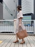 まゆみんのワンピース「【洗濯機で洗える&防シワ】強撚ポリストレッチ・配色フレアースリーブワンピース(ベルト付き)」を使ったコーディネート