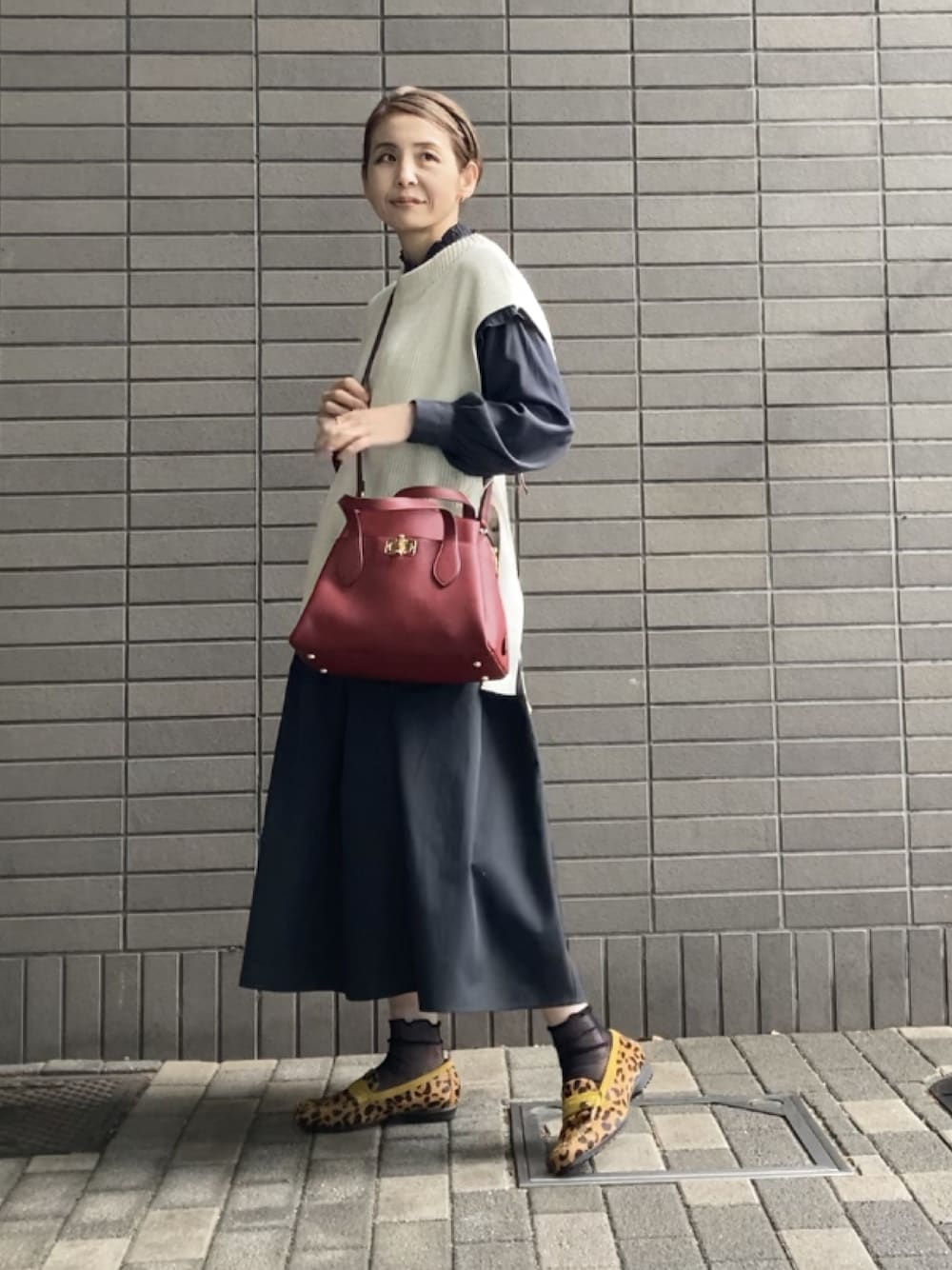● サイドベルトニットベスト ap retro 休日にお仕事コーデにと、大活躍中。 サイドが開いていてベルトでアクセントプラスされているので、単調にならず寸胴見えを防いでくれます。 只今タイムセール中でかなりお買い得です。 ● スニーカーローファー fitfit レオパ×イエローの組み合わせがめちゃくちゃかわいい♡ 網ソックス合わせて休日仕様に。 見た目だけではなく、fitfitさんらしい足馴染みの良さ、歩きやすさも大きな魅力。 一足は持っていたい優秀ローファーです。 赤バッグはずっと愛用している Salon de Rubanのハンドバッグ。 軽くて疲れないしバンブーのパーツが可愛くて可愛くて。 スカートはGUの。 先日何気なく店舗で見ていたら俄に欲しくなって買ってもうた。