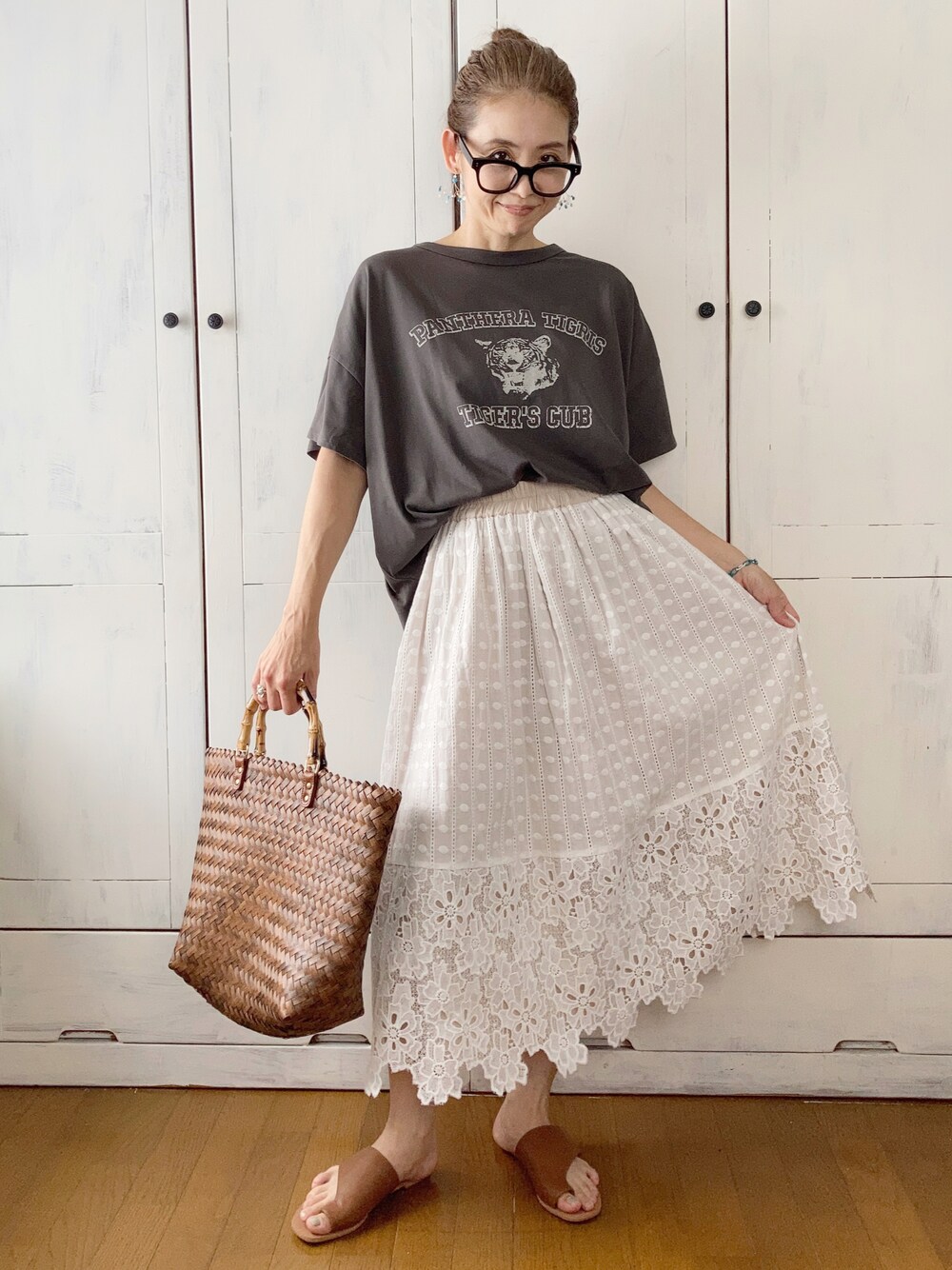 ● ヴィンテージ風プリントTシャツ COTORIKA ゆるっと着心地の良いTシャツ。 強めなトラさん柄。 甘いスカート合わせました。 みなさま体調気をつけて良い週末を!