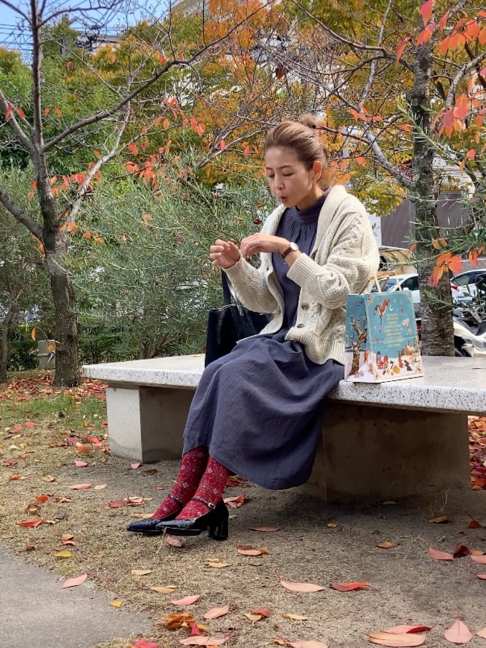 手にとまった虫ちゃんを吹き飛ばそうと試みるも、微動だにしてくれず。 しばし共に過ごしました。 ●アラン柄ショールカラーカーディガン Crea delice ナチュラル素材にこだわったクレアデリスさんの新作カーディガン🐏 ショールカラーがおじさんぽくてほっこりかわいいー♡ 厚過ぎないので気軽に羽織れていいです。 ウール混なのであたたくてうれしい! 中に着ているヘリンボーンハイネックワンピースもクレアデリスさんの。 ●WINTERLAND<着圧ソックス> SockWell 冬らしい柄がシーズンムードを高める一足⛄️ 中圧力で程よく気持ちよい履き心地です。 ほんのりと底にクッションが入って足裏がラクです。 心が躍る雰囲気なので、プレゼントにもおすすめ🎁 品番:[SW92W] ●ANITA LILLE SKW3064<腕時計> SKAGEN 先日はごりごりのお仕事コーデに合わせましたが、今回は休日カジュアルコーデに。 温かみのあるファッションにもよく合いますね。 手元が明るくなる、同じスカーゲンさんのブレスレットも一緒に着けて、楽しい休日感を高めます✨ ●ポインテッドヒールニーカーストラップ fitfit 届いてからずっとお気に入りでつい履いてしまう。 いつものように長距離歩く休日でしたが、疲れ方が本当に少なくて済みます。 コツコツ音が気にならないのもストレス回避の秘訣。 かわいい靴下が映えるつやつやのエナメルが休日に華を添えてくれました👠 ふらっと立ち寄ったカルディコーヒーで クリスマスのお菓子を色々購入🎄 クリスマス仕様の紙袋もかわいい♡ クリスマスに向かうこの時期大好き!