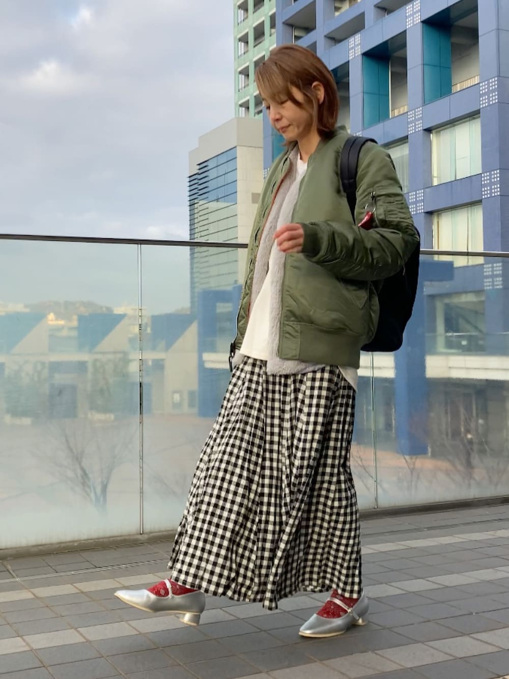 お仕事コーデ。 ●MA-1タイト フライトジャケット(日本スペック)リバーシブル Alpha Industries 暖かくて軽くてかわいいので 先日からヘビィに着用中。 風を通さない工夫が随所にあります。 ● カフタン裏毛スウェットルーズプルオーバー ap retro ● [SW92W] WINTERLAND 中圧力 ウルトラライトクッション SockWell ● フェイクファーノーカラージレ mi via loca