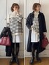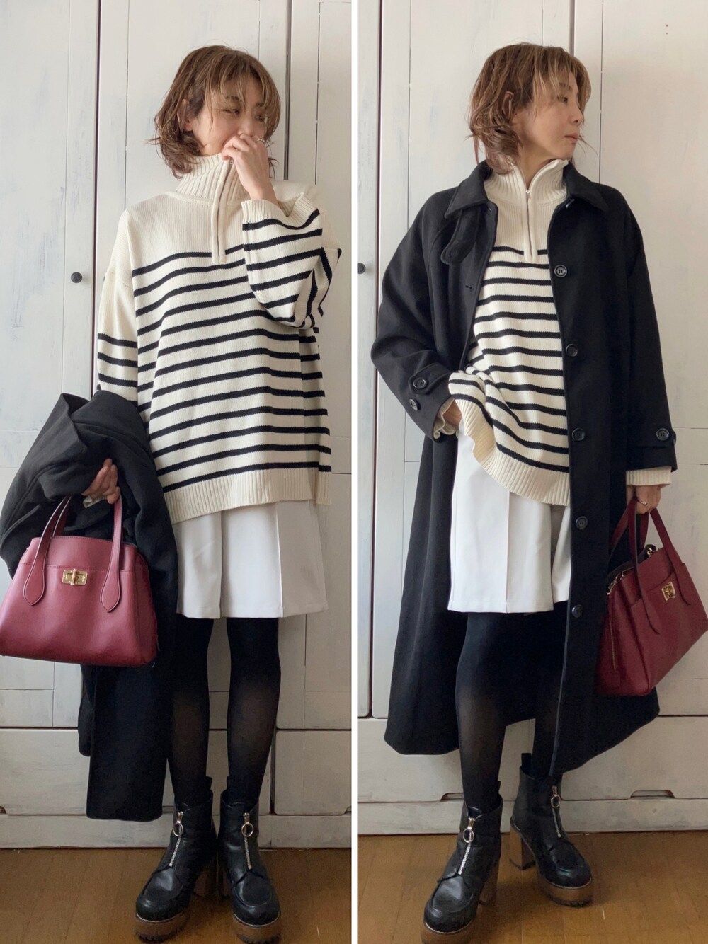 明日から仕事だなんて 信じないもん。 ● ハーフZIPオーバーニット パネルボーダー ap retro 新作のこのニットかわゆし! ハーフジップでゆるっとしたサイズ感。 程よい厚みがあり着心地良いです。 冬のボーダー柄も爽やかで好き♡ コートもアプレトロさん。