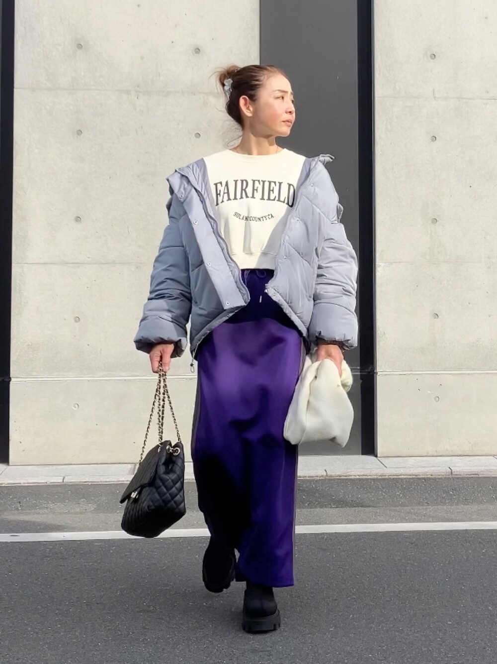 ジャージっぽいスカート活躍中☺️ 私の好きな美しいあのかたに トップスかわいいと褒められて 嬉しかった日でした🥰 トップス @uleula.official スカート @mivialoca エコダウンジャケット @wego_zozo バッグ @florge_by_florist ヘアクリップ @florge_by_florist ブーツ @zara #pr#mivialoca #uleula