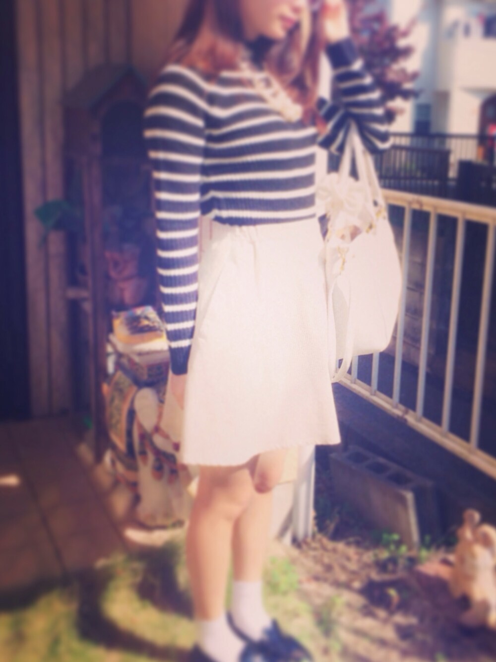 ホワイト系のスカートを着用したレディースの秋コーディネートの1枚目の写真