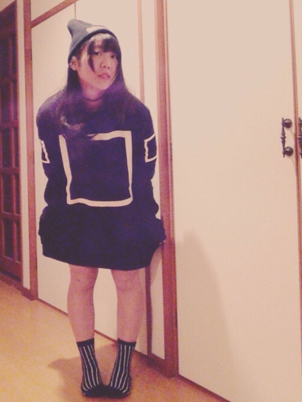 このForever21のアウターお気に入りなの メンズのLをワンピースにして着てます デザインかわいすぎだし1990円だった安い 好きな色は黒です!って感じだね このニット帽も1000円しないの!つよい! 着てないけど上着はwwl!のコートにしたよ〜う 靴は黒コンバースのハイカット〜靴紐の色金に変えたヤツ〜 今日化粧濃いめ👀!