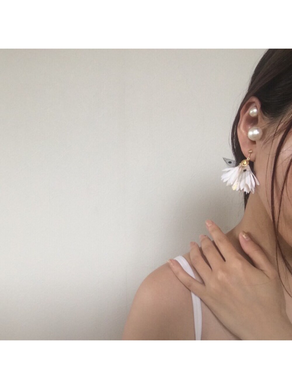 ホワイト系のイヤリングを着用したレディースの秋コーディネートの1枚目の写真