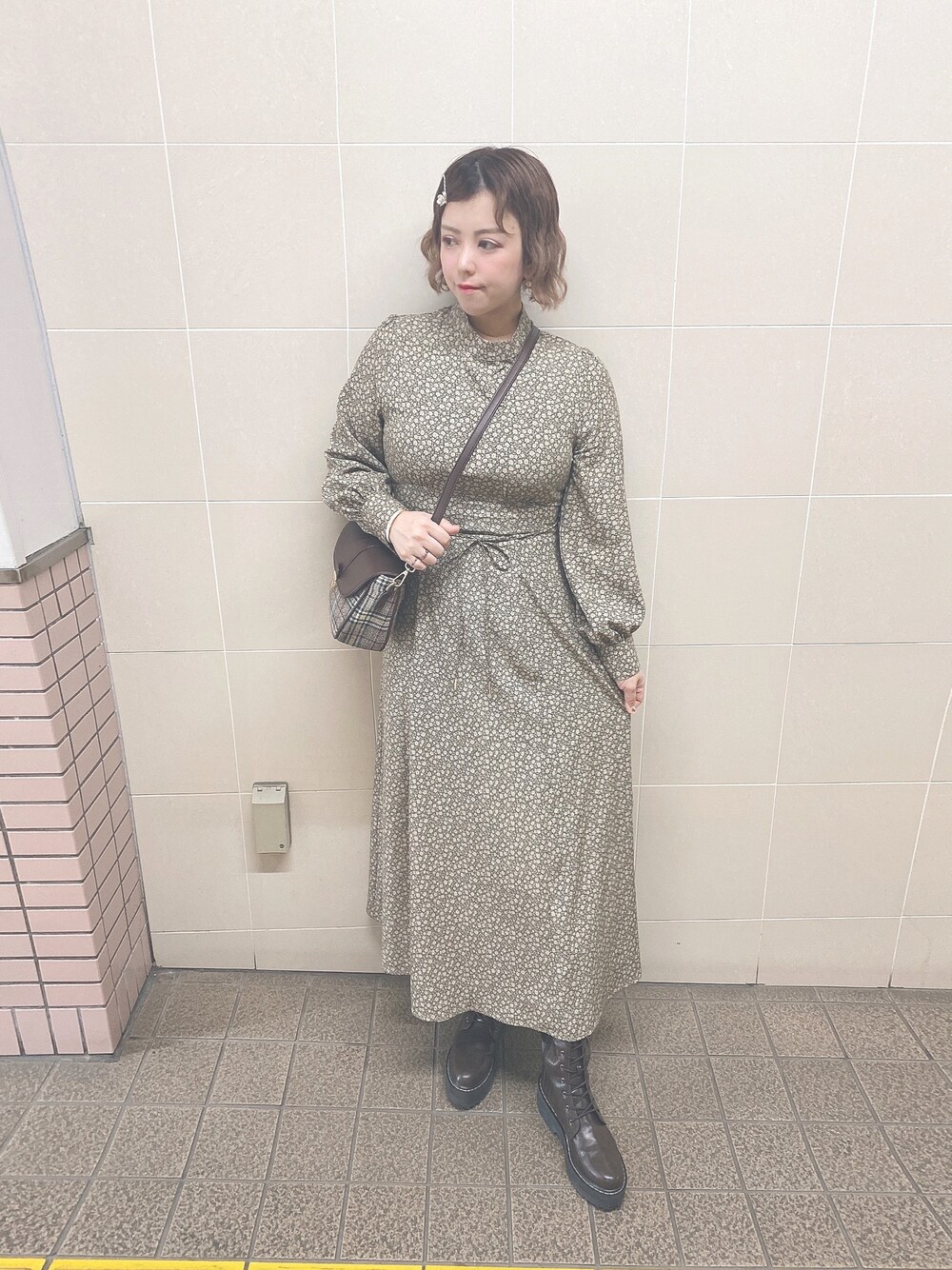 小花柄ワンピース に レースアップロングブーツ トレンドの人的な