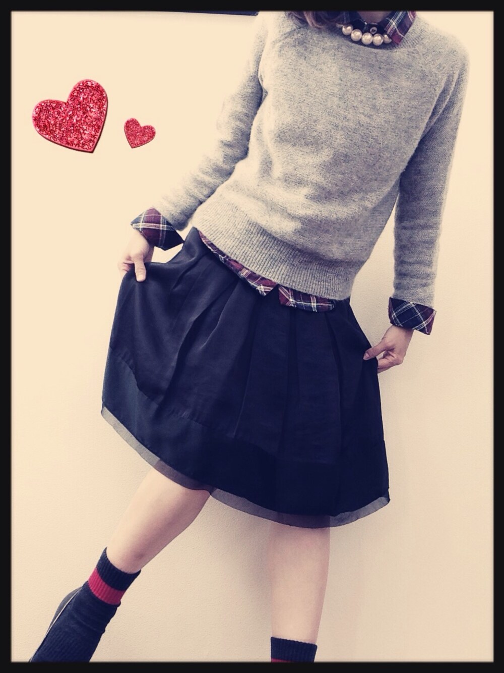 グレーのニットの下に着るの、白シャツか迷って チェックシャツに。 ポイントになってよかったかも。