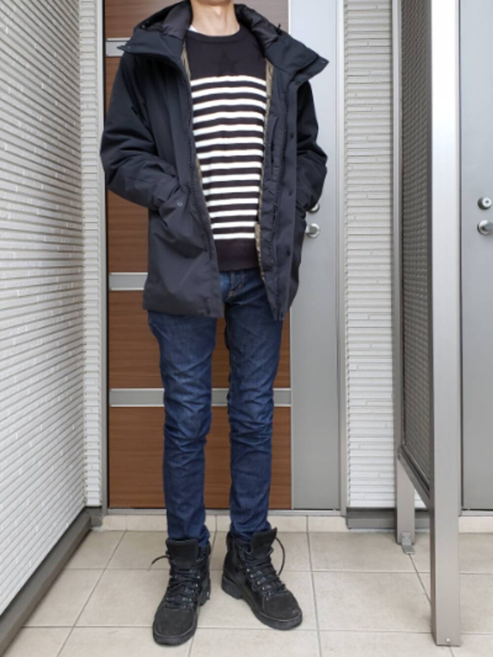 ユニクロのハイブリッドダウンパーカにAZULのボーダーニットとインディゴのスキニーデニムを合わせました。 足元は黒のトレッキングブーツです。