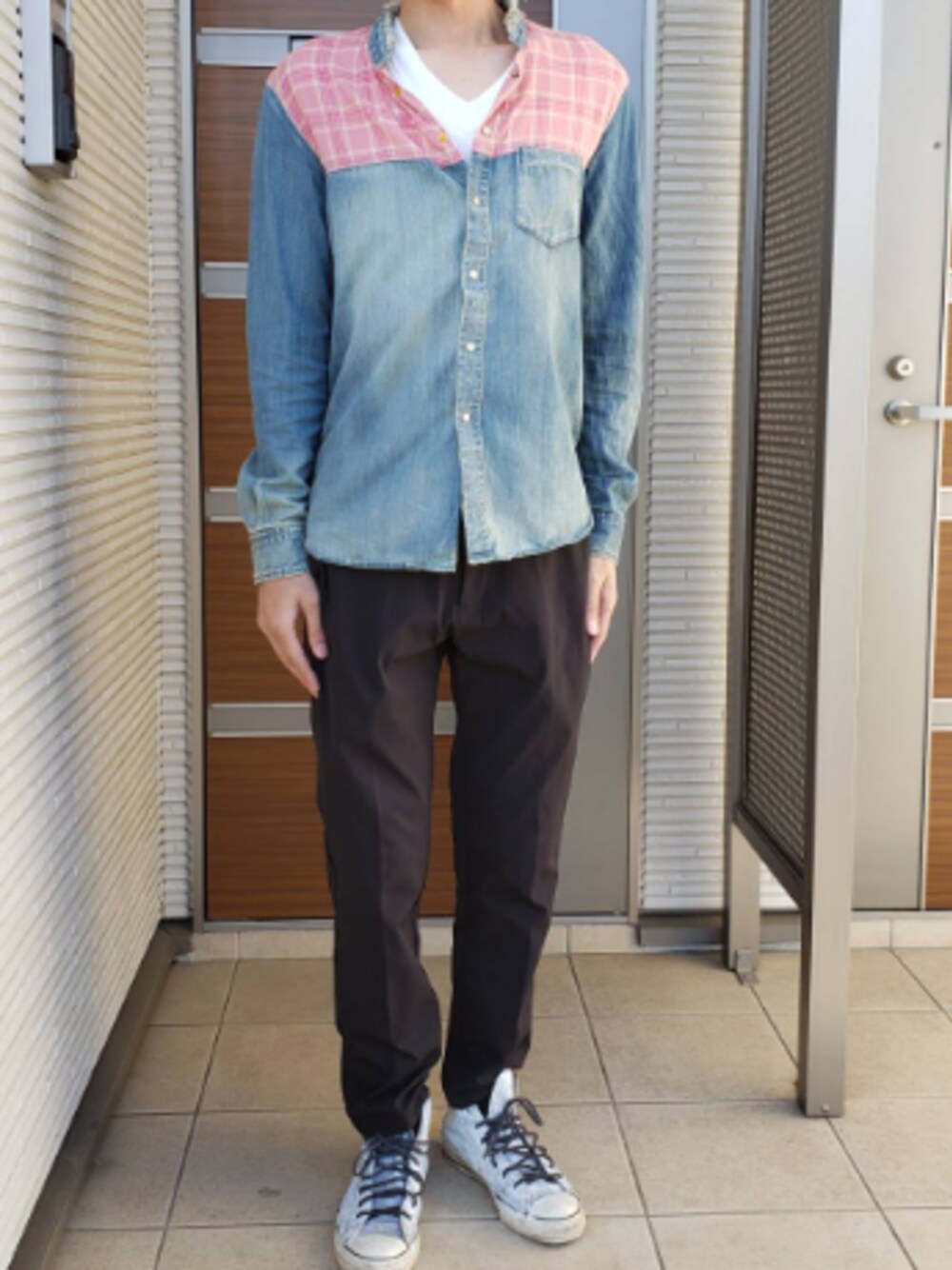 ムーンエイジデビルメントのデニムシャツにユニクロのアンクルパンツを合わせました。 足元はコンバースオールスターです。
