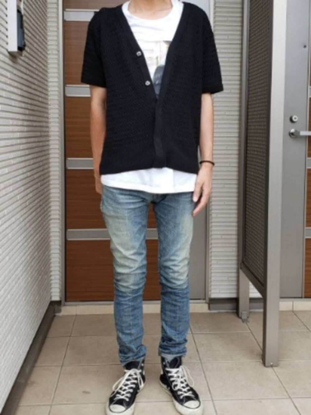 MoonageDevilmentのT-shirtにAZULの半袖カーディガンとMoonageDevilmentのデニムを合わせました。 足元はコンバースオールスターメイドインジャパンです。