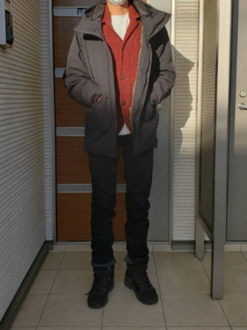 UNIQLOのハイブリッドダウンパーカにTKのニットカーディガンとUNIQLOのヒートテックスリムフィットジーンズを合わせました。 足元はmoonagedevilmentのマウンテンブーツです。