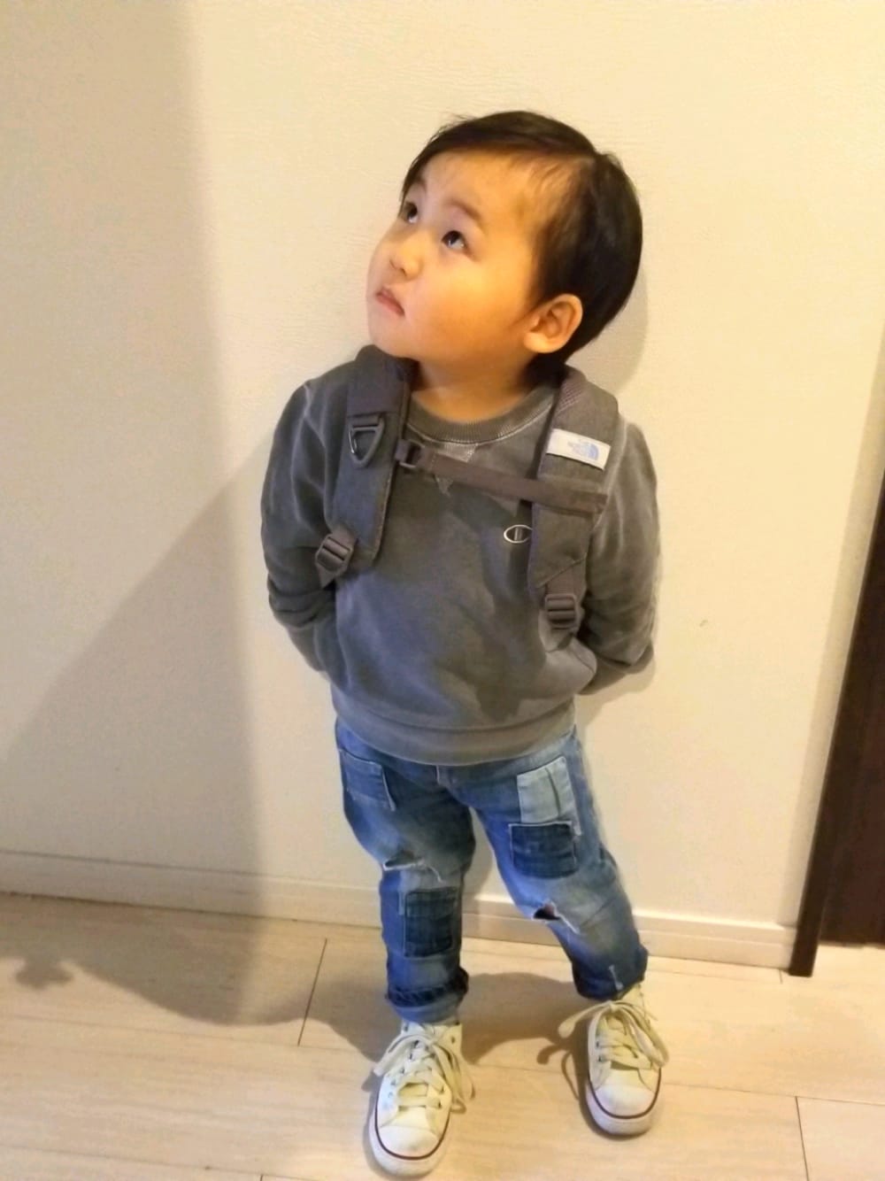 2歳次男の今日のコーデ👕 気づけば全てお兄ちゃんのお下がり😓💦 ダメージデニムはもともとさりげないダメージでしたが、今はかなりのダメージに💦💦 フリークスストアのチャンピオンのスエットは色合いと生地がお気に入りです💕