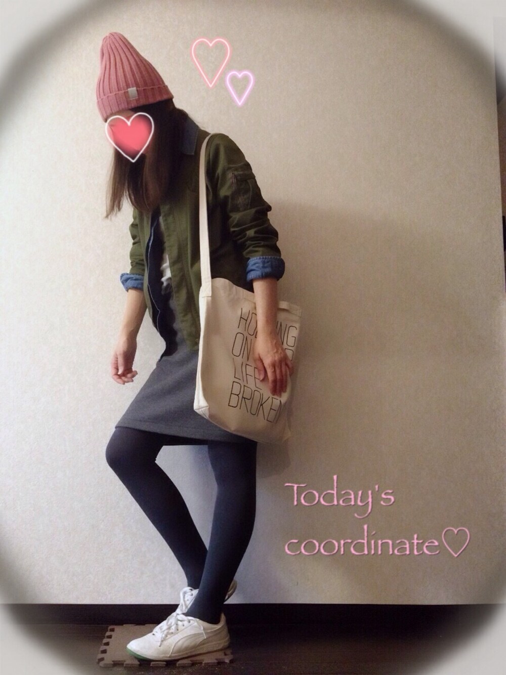 カーキ✖️ピンクを入れたくて。 デニムシャツにタイツスカートでハンサムな感じに?