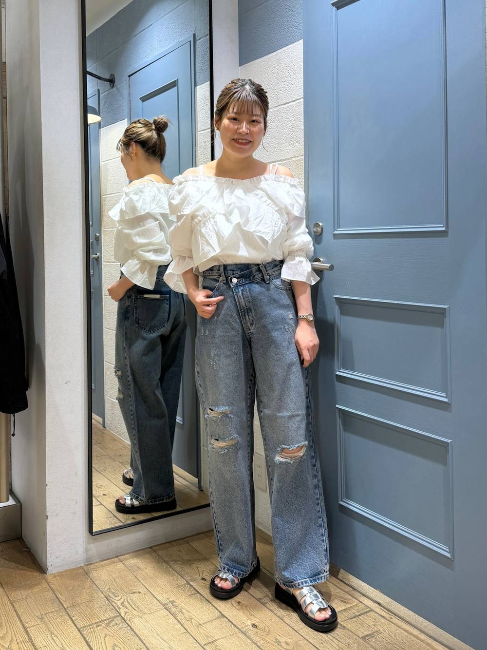 ご覧頂きありがとうございます🎀 【ブラウス】 オフショルとしても2wayで着て頂けます。首元はVネックになっているので華奢見えするブラウスになっています。デニムやスラックス合わせなどがオススメです◎ 【デニム】 ワイドすぎないシルエットなのでスッキリ穿いていただけます。ウエストがアシメになっておりトップスはタックインして着て頂くとデザインが見えて可愛いですよ◎ 159cmでフラットシューズ合わせでも引きずらずに穿けました! Instagram→【】 是非、フォローお待ちしております♡