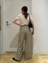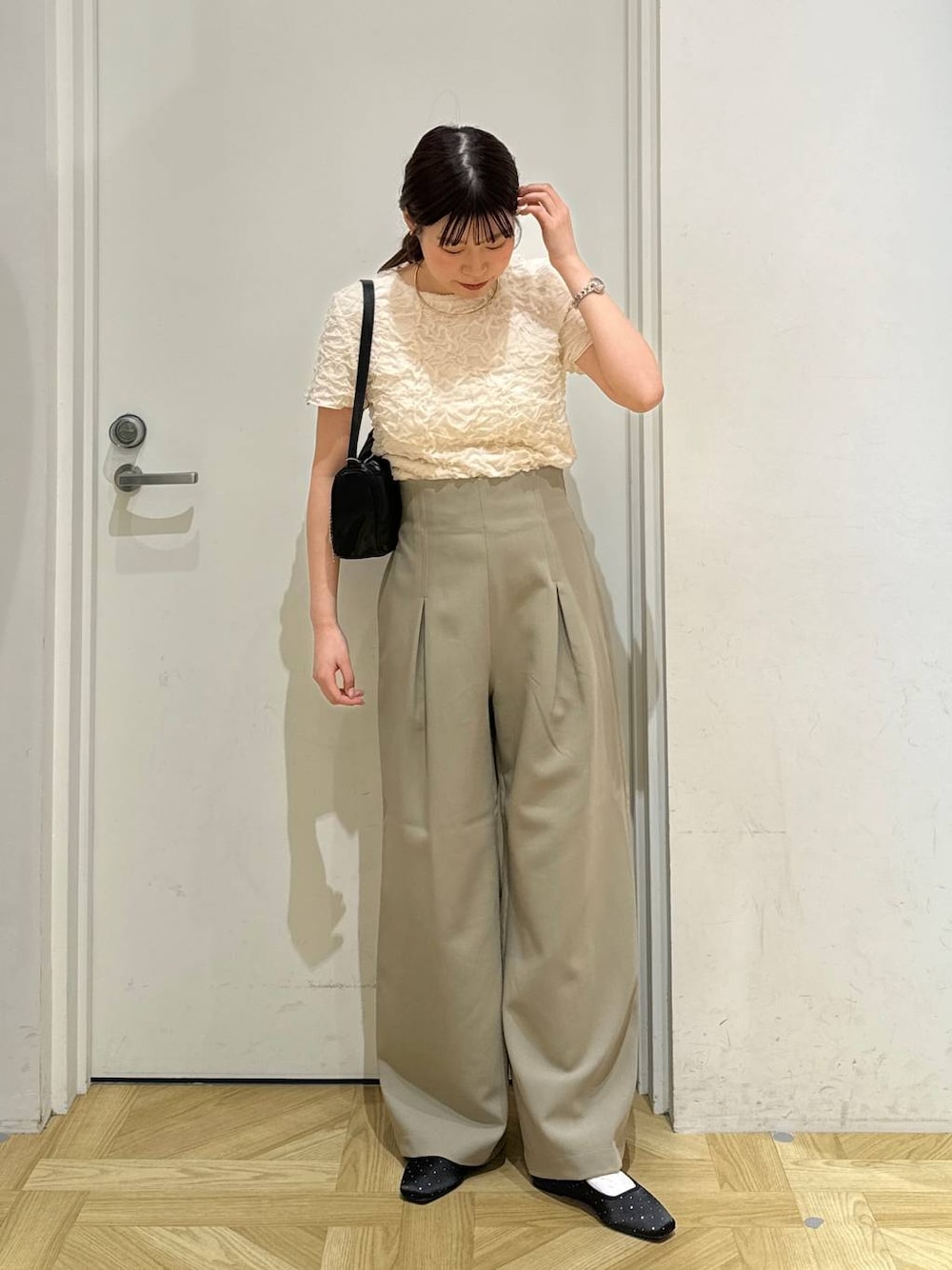 大人気なトップスで綺麗め淡色コーデを 組んでみました🐏 パンツはフロントにタックが入っており ハイウエストなので美脚効果抜群です✨ バッグにジップが付いておりウエストにゴムがついているので着脱もしやすいです! 是非参考になれば嬉しいです🪽 Instagram→[]