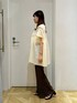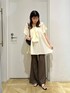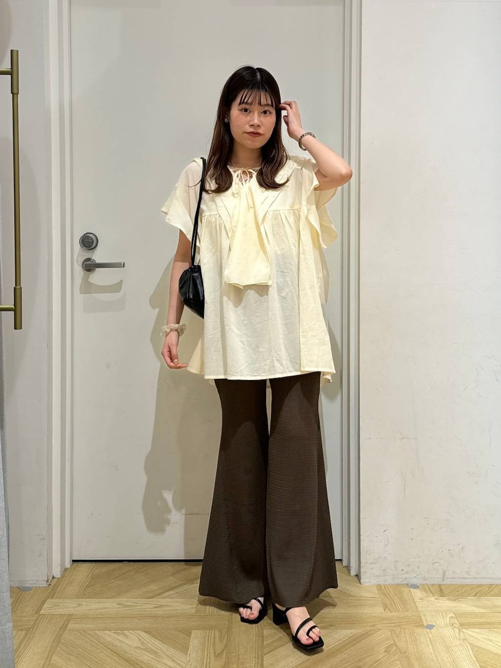 大人気のブラウスを使った 夏の淡色コーデです🧺🤍 ブラウスは襟元のフリルは大ぶりに見えますが 落ち感がありボリュームも出にくいので甘くなり過ぎずに 着て頂けます🌼✨ フレアパンツも全周ゴムで159cmでフラットなシューズで引きずらずに穿けました◎ Instagram→[] 是非参考になれば嬉しいです🪽