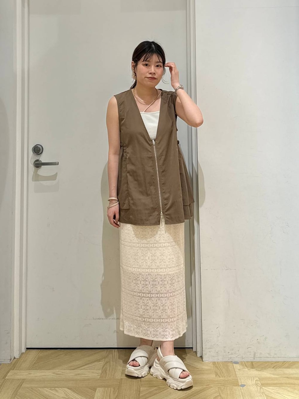 淡色カジュアルコーデ🧺✨ カジュアルになりすぎないように タイトスカートで合わせたのがポイントです💭 ベストはこれからの時期、キャミワンピースなどに羽織っるのも◎ Instagram→[] 是非参考になれば嬉しいです🌼