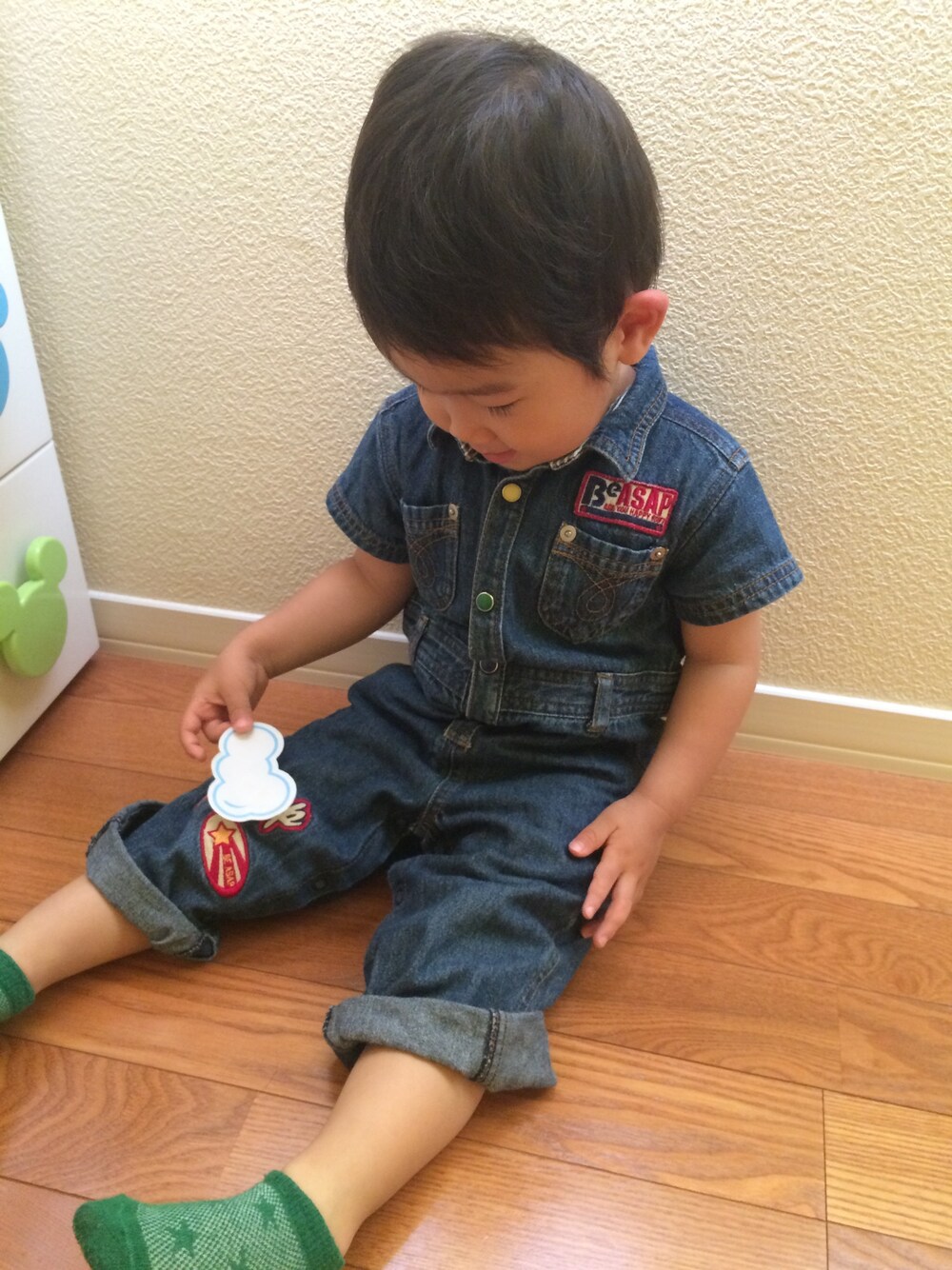 デニムのロンパースはそろそろサイズアウト。 やのに「かっこいい」と言うて着たがる長男。 若干丈短いので、ロールアップしてごまかす(笑)