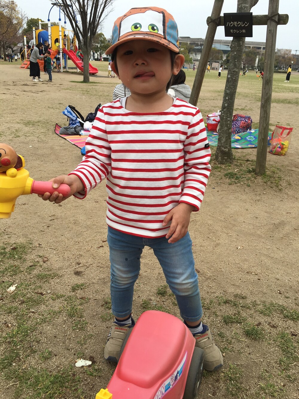 公園コーデ♪ お気に入りのアンパンマンの乗り物が 破損😱😱😱 大号泣😭 からの、お友達が 落としたネジを見つけてくれるという 奇跡✨ 良かったぁ!!!!