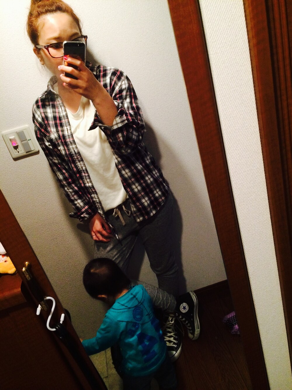 ママの楽チン公園コーデです * チェックシャツは旦那からの借り物 * * 何てないコーデですが * 初投稿ドキドキ * *