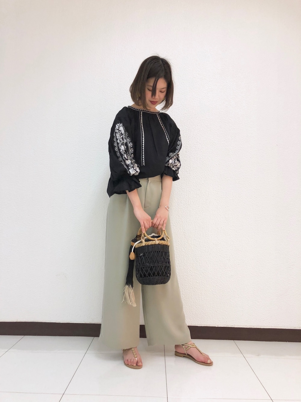 いつもいいねありがとうございます😊✨ ヌキテパのブラウスが可愛い💓 カタログの時から目をつけていたアイテムの一つです!いつもはデニムで合わせるところをツヤ感のあるワイドで🌸