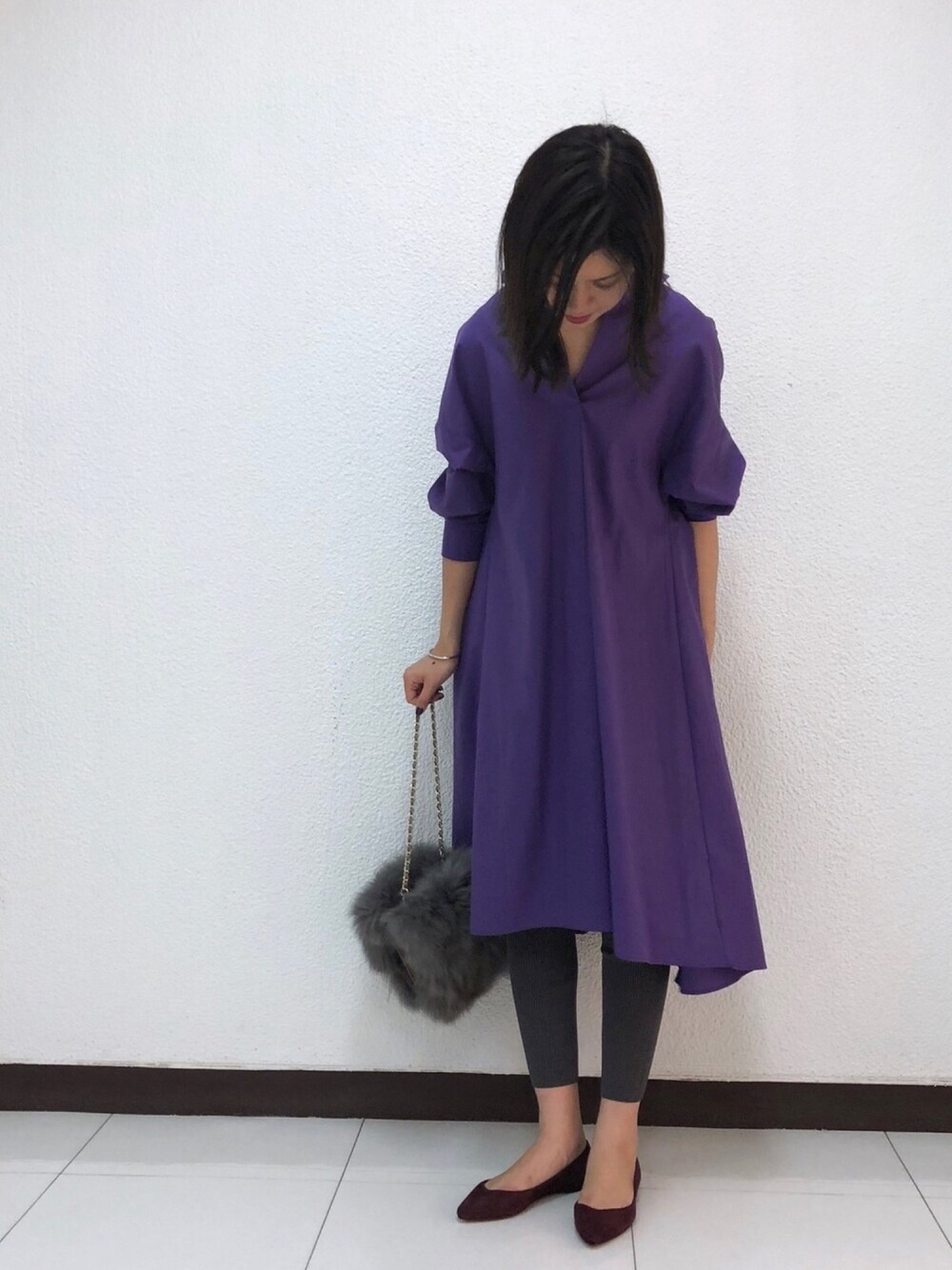 いつもご覧頂き、ありがとうございます😊💓💓 今季トレンドのスキッパーワンピースとレギンスのコーディネート🎶 レギンスを重ねるだけでいつもとは違った雰囲気に! パープルカラーで鮮度出しも忘れずに