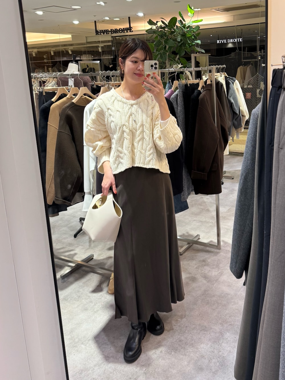 【ニット】 ケーブルデザインが素敵なニット 少し短めの着丈でスタイルアップも叶います 【スカート】 38サイズ シルエットの綺麗なマーメイドスカート ウエストゴムデザインで履き心地も抜群です