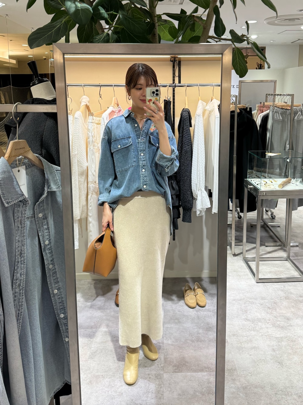 【シャツ】 羽織りとしても1枚着としてもおすすめのデニムシャツ 眺めの着丈でイン、アウトスタイルどちらでも決まります 【スカート】 38サイズ 伸縮性のある生地で履き心地も抜群のスカート さりげないラメで華やかに見せてくれます。